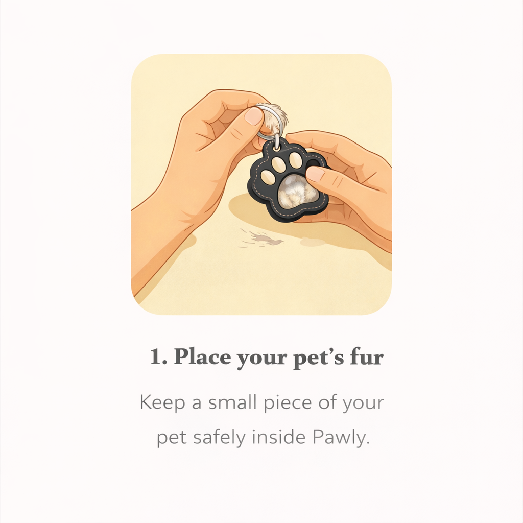 Simply open the compartment, place a small amount of fur inside, then close it securely. Attach PAWLY™ to your keys, bag, or backpack.